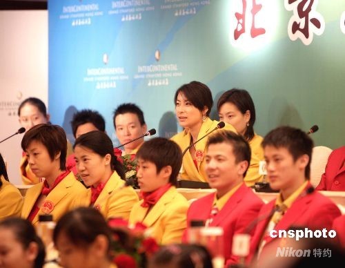 北京奧運會金牌運動員代表團八月二十九日至三十一日訪問香港。八月二十九日下午代表團抵達香港后舉行媒體見面會。中新社發(fā) 張勤 攝