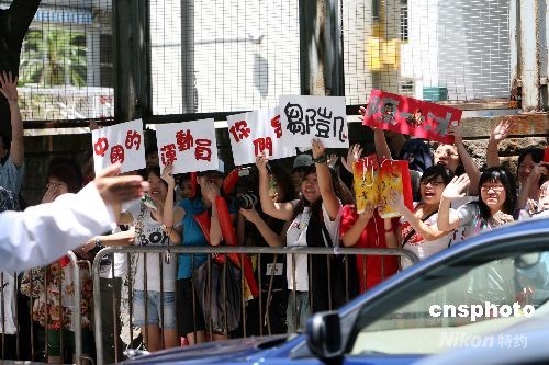 北京奧運(yùn)會(huì)內(nèi)地金牌運(yùn)動(dòng)員代表團(tuán)在香港伊麗莎白體育館作示范表演,大批 “粉絲”在場(chǎng)外苦候,希望一睹金牌選手風(fēng)采。中新社發(fā) 洪少葵 攝