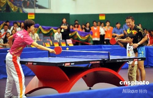八月三十日,在北京奧運奪得金牌的中國男女乒乓球運動員在香港示范表演,男單金牌得主馬琳指導一位小朋友與女單金牌得主張怡寧砌磋球技。中新社發(fā) 鄧慶樂 攝