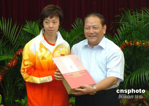 中央駐澳聯(lián)絡(luò)辦九月一日宴請(qǐng)?jiān)L問(wèn)澳門的奧運(yùn)金牌運(yùn)動(dòng)員代表團(tuán)。圖為中聯(lián)辦主任白志健向運(yùn)動(dòng)員代表張怡寧贈(zèng)送紀(jì)念品。中新社發(fā) 畢永光 攝