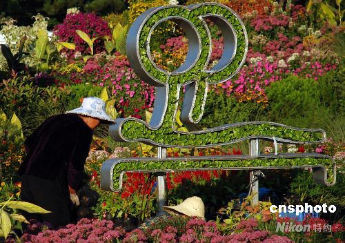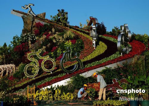 2008年9月1日,20個殘奧會運動造型標志亮相北京天安門廣場。據介紹,今年的廣場擺花是歷史上最長的一次,分三個階段制定主題,一直持續(xù)到10月份。中新社發(fā) 楊慧峰 攝