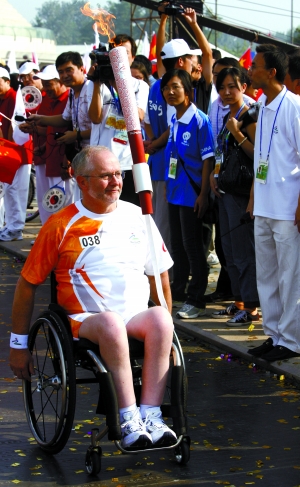 昨天上午,國(guó)際殘奧委會(huì)主席克雷文在世紀(jì)壇完成了第38棒傳遞。不需幫扶,他用自己強(qiáng)健的雙臂搖動(dòng)輪椅“跑”完全程,印證了他對(duì)“殘疾人需要獨(dú)立”的理念。傳遞時(shí)間雖短,但中午記者在其下榻飯店采訪(fǎng)時(shí),他仍余興未盡,他興致勃勃地談起了他對(duì)北京、對(duì)殘疾人運(yùn)動(dòng)的看法。