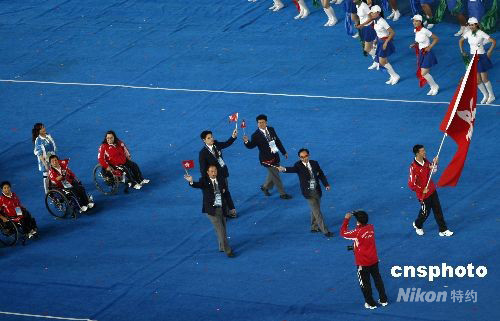 9月6日20時(shí),北京2008年殘奧會(huì)開幕式在國(guó)家體育場(chǎng)“鳥巢”舉行,圖為中國(guó)香港代表團(tuán)入場(chǎng) 。 中新社發(fā) 盛佳鵬 攝