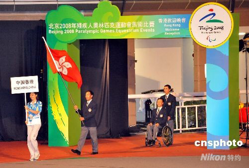 九月六日,北京二零零八年殘奧會(huì)馬術(shù)比賽開幕式在香港舉行歡迎晚會(huì),香港殘奧馬術(shù)選手葉少康在運(yùn)動(dòng)員入場式上進(jìn)場。中新社發(fā) 鄧慶樂 攝