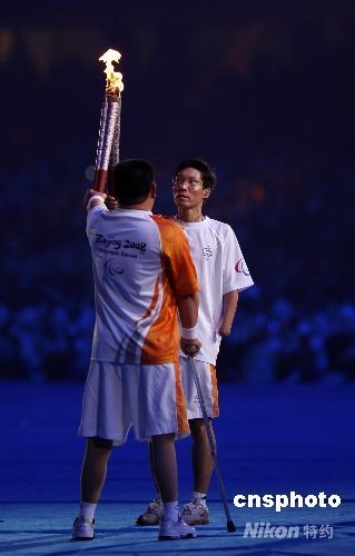 9月6日晚,北京2008殘奧會(huì)開幕式在國(guó)家體育場(chǎng)“鳥巢”舉行。運(yùn)動(dòng)員進(jìn)行火炬?zhèn)鬟f。