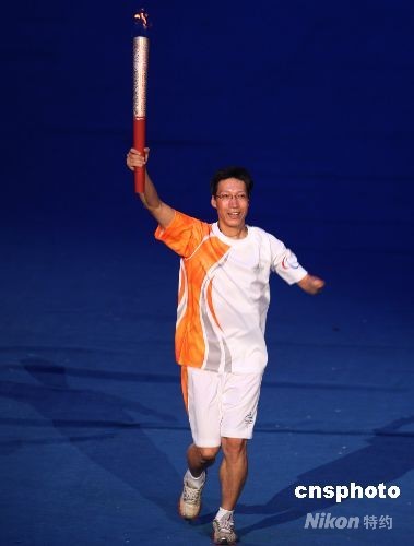 圖為武云虎點(diǎn)燃田徑運(yùn)動(dòng)員張宏偉手上的火炬。張宏偉曾經(jīng)在2000年悉尼殘奧會(huì)上獲得跳遠(yuǎn)和三級(jí)跳遠(yuǎn)兩枚金牌。中新社發(fā) 杜洋 攝