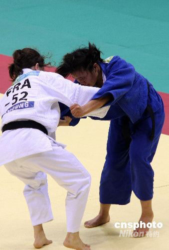 9月7日,在北京殘奧會(huì)盲人柔道女子52公斤級(jí)的決賽中,中國(guó)選手崔娜(藍(lán)衣)擊敗法國(guó)選手桑德里娜·奧里!ゑR蒂內(nèi),獲得金牌。中新社發(fā) 王韶驊 攝