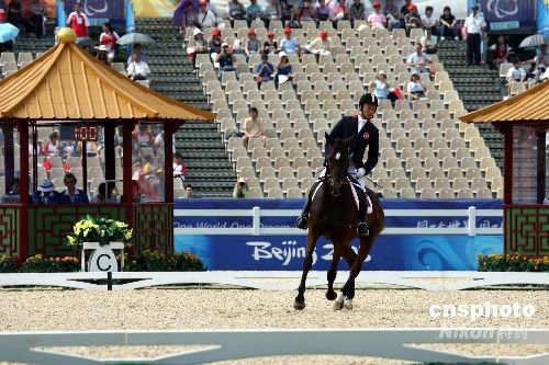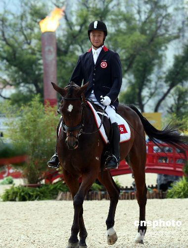 九月八日上午,殘奧會(huì)馬術(shù)賽在香港沙田賽場進(jìn)行盛裝舞步團(tuán)體賽,中國香港選手葉少康輕駕坐騎“履冰之注”出賽,獲得五十點(diǎn)七二七分。中新社發(fā) 洪少葵 攝