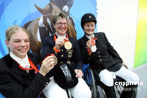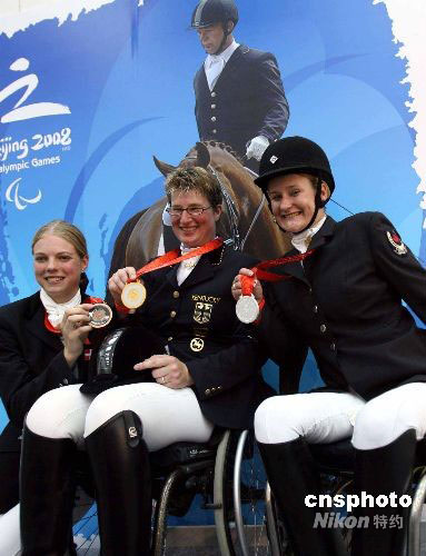 九月八日上午,德國選手布麗塔·納佩爾(中)在香港奪得北京殘奧會馬術(shù)比賽個人錦標(biāo)賽科目級別Ⅱ冠軍,摘取殘奧會馬術(shù)比賽首金,加拿大選手勞倫·巴威克(右)獲得銀牌,丹麥選手卡羅琳·尼爾森獲銅牌。中新社發(fā) 洪少葵 攝