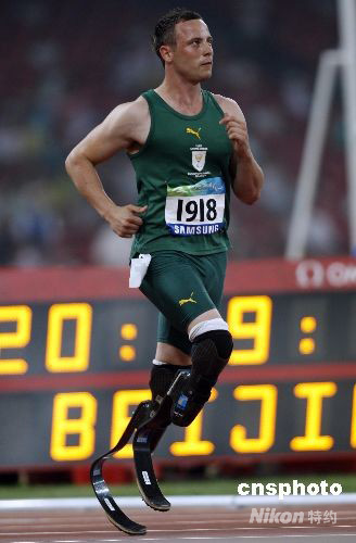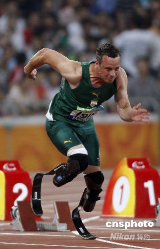 9月8日,北京殘奧會男子100米-T44預賽中,南非選手“刀鋒戰(zhàn)士”皮斯特瑞斯以11秒16的成績打破殘奧會紀錄。 中新社發(fā) 杜洋 攝