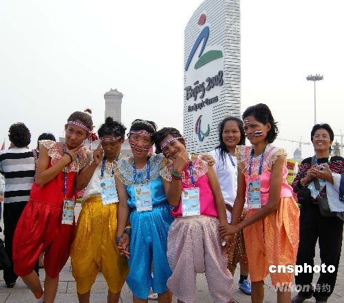 2008年9月8日,為北京殘奧會助威的泰國“啦啦隊(duì)”成員來到天安門廣場游覽,并高興地拍照留影。中新社發(fā) 玉龍 攝
