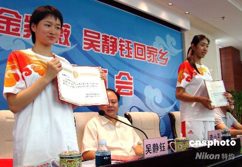 9月8日,江西省景德鎮(zhèn)市熱烈歡迎北京奧運(yùn)會(huì)冠軍金紫薇、吳靜鈺載譽(yù)回鄉(xiāng),景德鎮(zhèn)市婦聯(lián)和團(tuán)委分別授予兩人“三八紅旗手標(biāo)兵”稱(chēng)號(hào)和“五四青年獎(jiǎng)?wù)隆薄T诖舜伪本⿰W運(yùn)會(huì)上,金紫薇和吳靜鈺分別奪得賽艇女子4人雙槳項(xiàng)目和跆拳道女子49公斤級(jí)比賽冠軍。 中新社發(fā) 程萬(wàn)海 攝