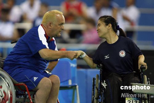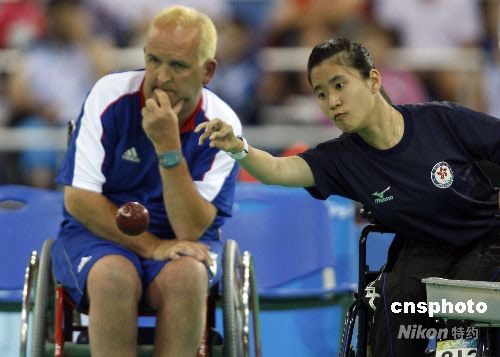 9月9日,中國香港選手郭,撛谟驳貪L球混合單打-BC2決賽中,戰(zhàn)勝英國選手奈杰爾-莫里,為中國香港隊摘得殘奧會首枚金牌。中新社發(fā) 杜洋 攝