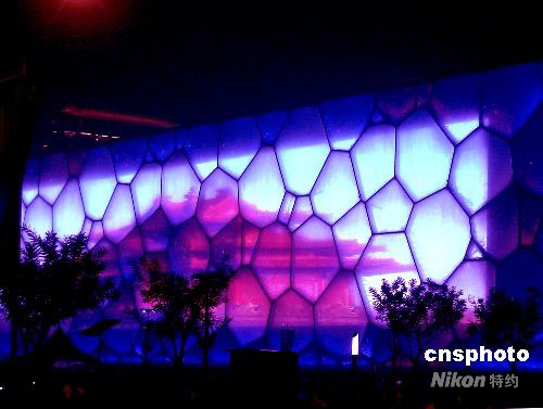在北京殘奧會舉辦時節(jié),國家游泳中心“水立方”的墻面上投影出著名的故宮角樓圖像,更顯示迷人的夢幻色彩。 中新社發(fā) 賈國榮 攝