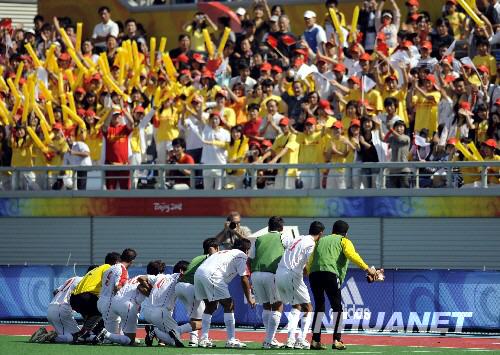 終場(chǎng)哨音響起,他們集體跑向北側(cè)邊線,彼此手搭肩頭站成橫排,然后雙膝跪地,向看臺(tái)上為他們加油的中國(guó)觀眾表達(dá)感激之情。意外的舉動(dòng),令現(xiàn)場(chǎng)觀眾先是一愣,隨即報(bào)以更熱烈的掌聲與吶喊。