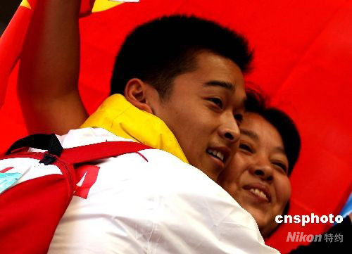 9月11日上午,北京殘奧會(huì)田徑比賽繼續(xù)在奧林匹克公園內(nèi)的國(guó)家體育場(chǎng)“鳥(niǎo)巢”舉行,在男子鐵餅F35-36級(jí)決賽中,F(xiàn)35級(jí)中國(guó)選手郭偉以54米13獲得1131分奪得金牌,并打破世界紀(jì)錄。獲得勝利的郭偉與在場(chǎng)觀戰(zhàn)的媽媽擁抱慶祝。 中新社發(fā) 任晨鳴 攝