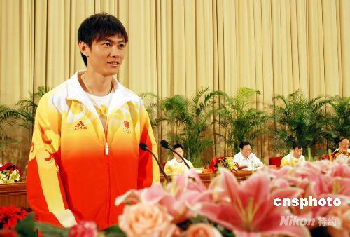 第29屆奧運(yùn)會(huì)男子佩劍個(gè)人冠軍仲滿在報(bào)告會(huì)上發(fā)言。中新社發(fā) 楊慧峰 攝