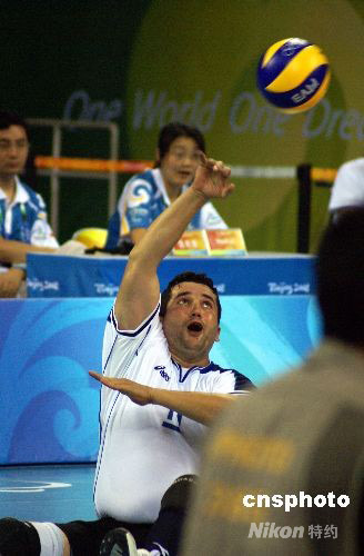 2008年9月12日,在北京殘奧會男子坐式排球半決賽中,波黑隊以3比0戰(zhàn)勝埃及隊,進(jìn)入決賽。 雙方隊員發(fā)球都好似舞蹈。中新社發(fā) 馬小剛 攝