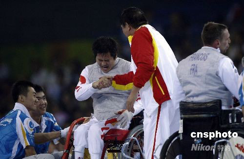 9月14日,北京殘奧會輪椅擊劍在北京國家會議中心擊劍館進(jìn)入首個比賽日,在男子個人花劍B級決賽中,10號種子中國選手胡道亮以15-8爆冷擊敗2號種子法國選手洛朗-弗朗索瓦,奪得金牌。