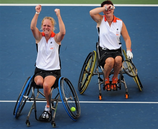 9月15日,北京殘奧會(huì)輪椅網(wǎng)球女雙總決賽中,荷蘭22歲的科麗·霍曼(左)和莎倫·瓦爾拉芬2-1戰(zhàn)勝同胞埃絲特·費(fèi)海爾和伊斯克·格里菲翁,取得本屆殘奧會(huì)輪椅網(wǎng)球女雙金牌。賽后這對(duì)組合喜極而泣。