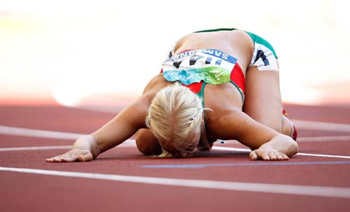 9月12日,在國家體育場進(jìn)行的北京2008年殘奧會女子200米T38級首輪比賽中,白俄羅斯選手基魯先卡以30秒79的成績晉級決賽。賽后她深情的親吻跑道。新華社記者 廖宇杰 攝