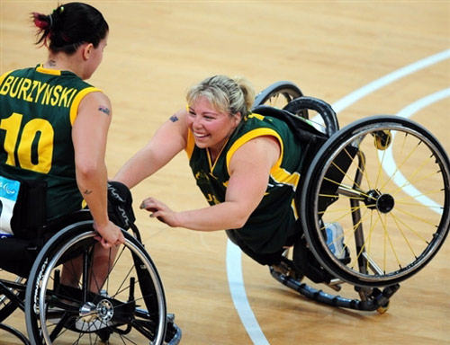 9月8日,殘奧會(huì)輪椅籃球賽,澳大利亞隊(duì)對(duì)巴西隊(duì)的比賽中,澳大利亞的凱莉·戈西跌倒后,另一名隊(duì)友克萊爾·布爾津斯基前來幫忙。