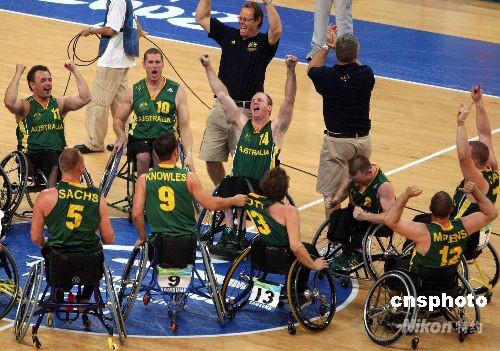 圖為澳大利亞隊慶祝獲北京殘奧會輪椅男籃冠軍。