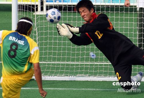 9月17日下午,北京殘奧會五人制足球決賽在北京奧林匹克公園內(nèi)舉行,雅典殘奧會冠軍巴西隊依靠強大的實力,最后以2比1擊敗中國隊蟬聯(lián)冠軍。中新社發(fā) 任晨鳴 攝