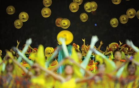 “歡慶篇章”是整臺晚會“寄給未來的一封信”的壓軸戲,而“草帽舞”是“歡慶”中的高潮部分、晚會的亮點之一。昨晚草帽舞華麗登場時,成都的姑娘們從舞臺的左臺口向舞臺的右底角走“斜線一字”,動作整齊,節(jié)奏分明,邊行進邊傳遞草帽,她們的隊列沉穩(wěn)舒緩,時圓時方,變化萬千。到達鳥巢中間時,草帽突然像金色的花朵,從演員手中快速飛出,在空中彼此飛舞,宛如向日葵花簇簇綻放,蔚為壯觀。而在草帽舞隊的四周,還有兩千多人輔以奔放灑脫的舞蹈表演。此時鳥巢內(nèi)已是掌聲雷動,歡呼陣陣。整個節(jié)目傳遞的是青春、是快樂,是少女的激情與奔放,是自由與陽光,是未來的希望,表演服飾也以紅黃為主調(diào),大紅艷麗,大黃成熟,直奔歡慶主題。成都的姑娘們退場后激動地說,她們的自信和當晚的演出成功,離不開奧組委領(lǐng)導(dǎo)的關(guān)心支持。據(jù)悉,這批專業(yè)演員全部由成都市文化藝術(shù)學(xué)校的專業(yè)舞蹈學(xué)生、演員和舞蹈教師組成。(周帥)