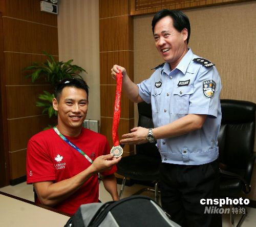 北京公交民警將獎(jiǎng)牌交到了加拿大運(yùn)動(dòng)員杰瑞德手中。