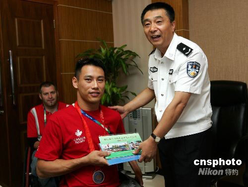 9月18日,一枚失而復(fù)得的北京殘奧會獎(jiǎng)牌由北京公交民警交還到了加拿大運(yùn)動(dòng)員杰瑞德手中。9月17日晚,加拿大運(yùn)動(dòng)員杰瑞德在乘坐出租車時(shí)不慎將自己的雙肩包遺忘在車上,公交民警接警后,在線索非常有限的條件下,只用了四個(gè)小時(shí),就將背包找回,里面有一枚寶貴的殘奧會橄欖球銅牌。中新社發(fā) 富田 攝