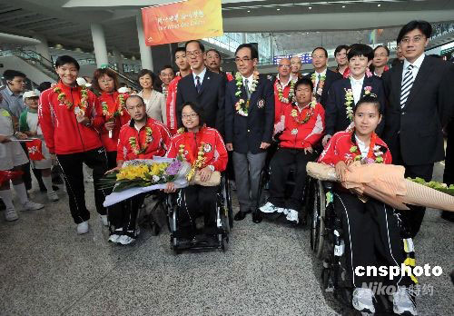 九月十八日,北京殘疾人奧運(yùn)會(huì)中國(guó)香港代表團(tuán)凱旋返港。香港民政事務(wù)局局長(zhǎng)曾德成前往迎接,并與代表團(tuán)團(tuán)長(zhǎng)伍澤連及運(yùn)動(dòng)員步出機(jī)場(chǎng)。中新社發(fā) 鄧慶樂(lè) 攝
