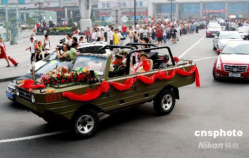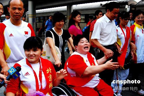9月21日早上8點30分左右,從北京駛向南昌的Z67次列車停靠南昌站臺,江西省參加北京殘奧會的3名運動員凱旋而歸。許多市民手捧鮮花、手舉紅旗來到現(xiàn)場夾道迎接運動員。中新社發(fā) 胡國林 攝