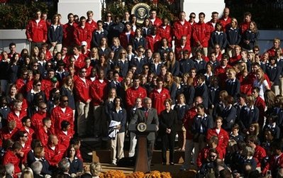 美國(guó)總統(tǒng)布什7日在白宮南草坪會(huì)見(jiàn)美國(guó)奧運(yùn)和殘奧代表團(tuán)。