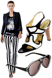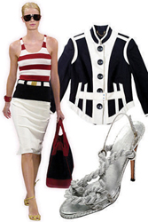 航海風貌的熱潮繼去年一直延續(xù)至今,條紋圖案依舊可以成為選擇的目標,只是本季的設計為航海主題略添了幾分女性柔美的元素。銀色絞繩式高跟涼鞋;金色船錨和紅珊瑚串成的項鏈;玫瑰紅與藍色條紋拼合而成的tubetop式的連衣裙裙擺都鑲著亮鉆。這一系列元素都為一向中性化的航海設計增添了女性主義色彩。牛仔布和斜紋布依舊熱門,Diesel的白色牛仔褲和襯衫、Trovata的綠色白邊T恤和寬松的闊口褲都是時尚達人們的寵兒。