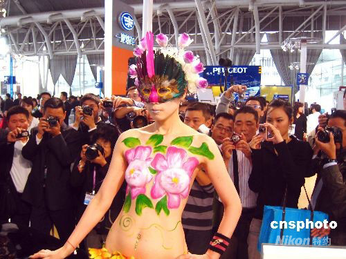 圖:人體彩繪車模亮相南京車展