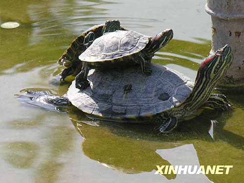 圖:巴西龜放生池內(nèi)“疊羅漢”