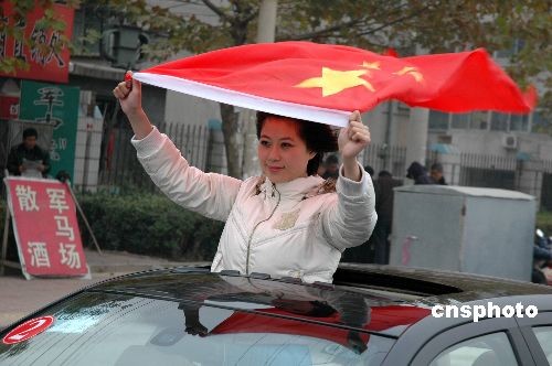 圖:少女持國(guó)旗巡游“感恩中國(guó)”