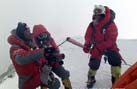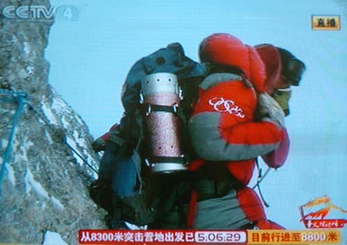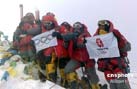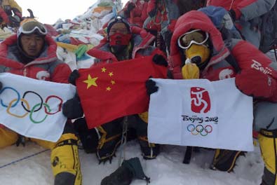 北京奧運(yùn)圣火成功今天上午9時(shí)許登上珠峰,登山隊(duì)員們在峰頂進(jìn)行了火炬接力,接力活動(dòng)結(jié)束后,隊(duì)員們在世界之巔展示熊熊燃燒的祥云火炬以及中國國旗、奧運(yùn)五環(huán)旗和北京奧運(yùn)會會徽旗。