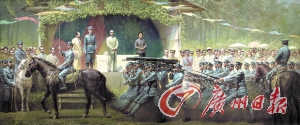 畫面的視覺中心位置是用竹木、竹笪子搭建起的“將臺”,上面以綠樹葉作為裝飾,背景處是典型的亞熱帶樹木,潘嘉俊說:“突出地域感、強調(diào)南方特色可以賦予歷史畫更強的生命力,同時又具有很強的繪畫性。”檢閱臺上站著孫中山和宋慶齡、軍校黨代表廖仲愷、校長蔣介石。正扛槍走過主席臺的學(xué)員們身姿挺拔、神態(tài)莊嚴(yán)。武器、戰(zhàn)馬雖然不多,但孫中山表情堅毅、眼神中充滿了期待,在他心里,這支隊伍雖然年輕,但卻將承載挽救中國革命和前途的歷史重任。