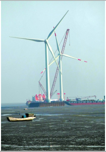 10月20日上午,隨著中國國電集團公司總工程師張宗富一聲令下,龍源江蘇如東海上(潮間帶)試驗風(fēng)場首批兩臺各1.5兆瓦風(fēng)力發(fā)電機組在距海岸線3公里的南通市如東縣南黃海環(huán)港外灘上緩緩啟動,電流立即匯入江蘇省電網(wǎng)。至此,中國首批海上風(fēng)力發(fā)電機成功并網(wǎng)發(fā)電,中國風(fēng)能由此跨入藍色海洋時代。