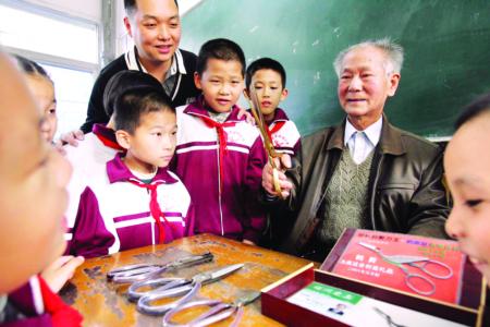 “同學(xué)們會不會說福州話啊?”福州電視臺《攀講》節(jié)目主持人“土豆”發(fā)問了!拔視!我會!”孩子們的情緒馬上高漲了起來,紛紛舉手,表示自己是個小小福州人!罢l知道我們福州的傳統(tǒng)手工藝有哪些?今天,我們給大家介紹三位傳統(tǒng)手工藝的傳人,首先是剪刀狀元!”在孩子們的掌聲中,“鄭興利”剪刀的第三代傳人鄭德官走上講臺,八十高齡的他首先拿起一把剪刀,為孩子們講起有關(guān)“福剪”的往事。同學(xué)們被新奇的故事吸引了。鄭老又拿出幾把自己生產(chǎn)的特色剪刀,有的剪刀頭鑄成圓弧狀防止傷人,有的剪刀小巧可愛,有一把剪刀做成了一只仙鶴的形狀。