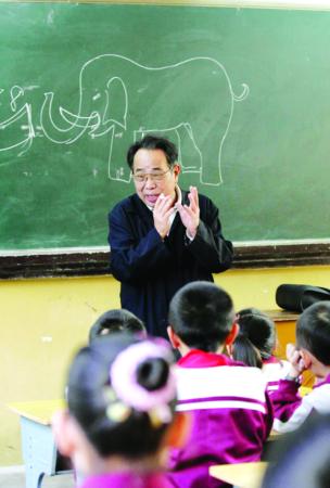 傳統(tǒng)牙雕的傳人馮蕉生不愧是藝術(shù)家,他幾筆就在黑板上勾勒出一頭大象,然后問同學(xué)們,什么材料可以用來雕刻,“木頭”、“石頭”、“蘿卜”,同學(xué)們說了好幾種,終于說到了象牙。