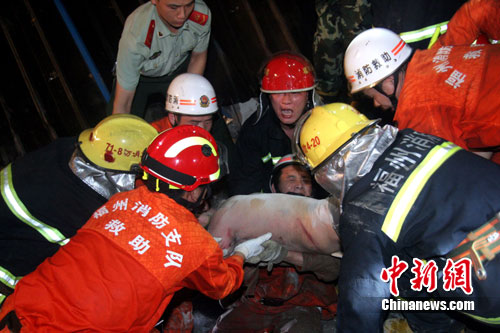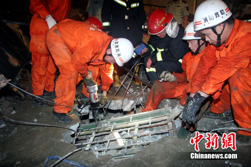 隨著救援進(jìn)程在加快,一塊塊阻礙救援的鋼筋混凝土樓板和房梁被移開。“利用液壓支撐工具把樓板撐起來,夾縫里有人!”為避免現(xiàn)場再次塌落,救援官兵利用液壓支撐工具把三樓樓板撐起來。21時55分,消防官兵在現(xiàn)場北面搜又救出1名被埋人員。