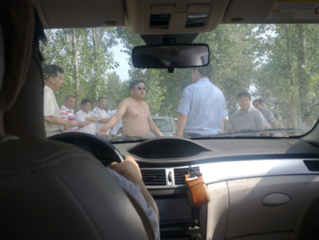 面對民警,在摩托車被推開后,不明身份人員仍不愿放行,“金鏈子”裸著上身更是蹲在車前不肯起來,稱“除非賠我們莊稼錢”……經(jīng)民警多次勸說,記者終于在當(dāng)日下午4時許安全抵達了狼城崗鎮(zhèn)政府。