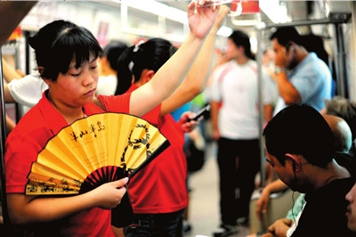 昨天上午8點(diǎn)多,記者擠在1號線“風(fēng)扇車”里,用手抹了一把臉上的汗水。從四惠東站到國貿(mào)站,這樣的動作重復(fù)了十多次。車廂內(nèi)的乘客,有的臉上掛著焦灼的表情,不時(shí)用手扇風(fēng),有的小心翼翼地避免和他人身體接觸,以免黏著汗水,有的用手輕捂著鼻子,試圖避開周圍的汗臭味。