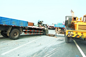 上午8時,記者趕到現(xiàn)場時,飲鹿池橋雙向仍有些擁堵。貨車事故發(fā)生在東向西最內(nèi)側(cè)車道上,一輛吊車正在把從事故車上分離出來的零件吊到其他貨車上運走,外側(cè)只有一條車道可供通行。而西向東的撞人現(xiàn)場已基本清理完畢,交通逐漸恢復(fù)。