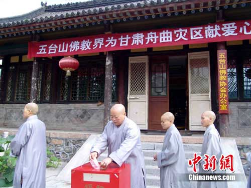 當(dāng)甘肅舟曲泥石流災(zāi)害的消息傳到五臺(tái)山時(shí),再次揪疼了五臺(tái)山僧眾的心。為幫助受災(zāi)群眾順利重建家園,身在佛門心系天下蒼生的他們,不論是黃廟的,還是青廟的,不論貧富,不分遠(yuǎn)近的大大小小的40多處寺廟和近千個(gè)四眾弟子,以同樣真切和濟(jì)世之情,共同援手,在不到一個(gè)小時(shí)的時(shí)間里,捐款數(shù)達(dá)到了53.6380萬(wàn)元人民幣,其中普壽寺捐款10萬(wàn)元,萬(wàn)佛閣6萬(wàn)元,塔院寺5.5萬(wàn)元、普化寺5萬(wàn)元,其它寺院均盡自己的力量出資捐助。目前,善款已轉(zhuǎn)交有關(guān)部門,但捐款活動(dòng)仍在繼續(xù)進(jìn)行。