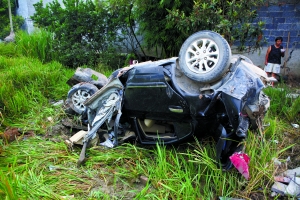 昨日凌晨,四川閬中市巴都大道發(fā)生一起車禍,一輛小轎車越過(guò)37米寬的稻田飛上二樓,將居民住房撞了一個(gè)直徑約1米的大窟窿。據(jù)圍觀的士司機(jī)介紹,小轎車能飛越37米寬的稻田,時(shí)速至少在每小時(shí)180至200公里以上。