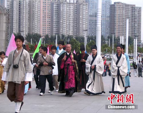 白楊是這群人里為數(shù)不多的女性。她告訴記者,自己一直就很迷戀中國古代的服飾,這次穿的衣服是在網(wǎng)上訂做的,總共花費(fèi)不足二百元,現(xiàn)在能有機(jī)會穿出來,真的很高興。今天在路上,還有人問白楊是不是韓國人,“呵呵,以后每逢傳統(tǒng)節(jié)日都會這樣穿著,我要讓大家知道這叫漢服!”